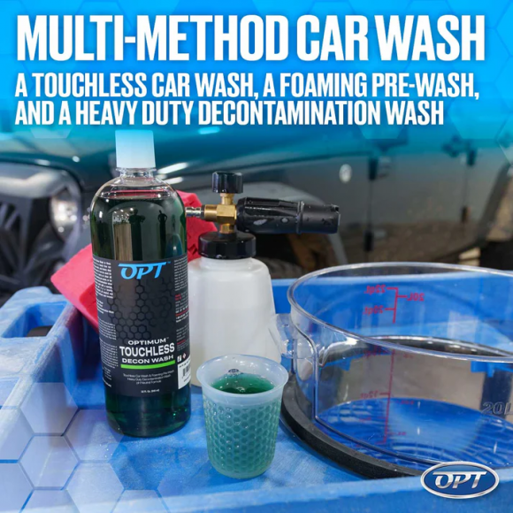 Optimum Touchless Decon Wash is an extremely powerful and versatile touch free car wash and heavy duty decontamination soap. It combines several essential auto detailing functions into one extra strength formula. It serves as a touch free car wash, a foaming pre-wash, and a heavy duty decontamination wash. It makes the perfect choice for touch free car washing and heavy duty decontamination.